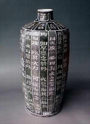 易武采用了十三個高46厘米左右的生坯,分別純手工書寫、雕刻6000多字的十三篇兵法。字體為易武自成一體具有古樸風格的書法體。十三個瓶上字體的大小都有不同,瓶子上都有旋轉的刀紋或變化的跳刀肌理,每只瓶上各部位色彩有微妙的變化,總的色調為黑綠、黑茶的古調。